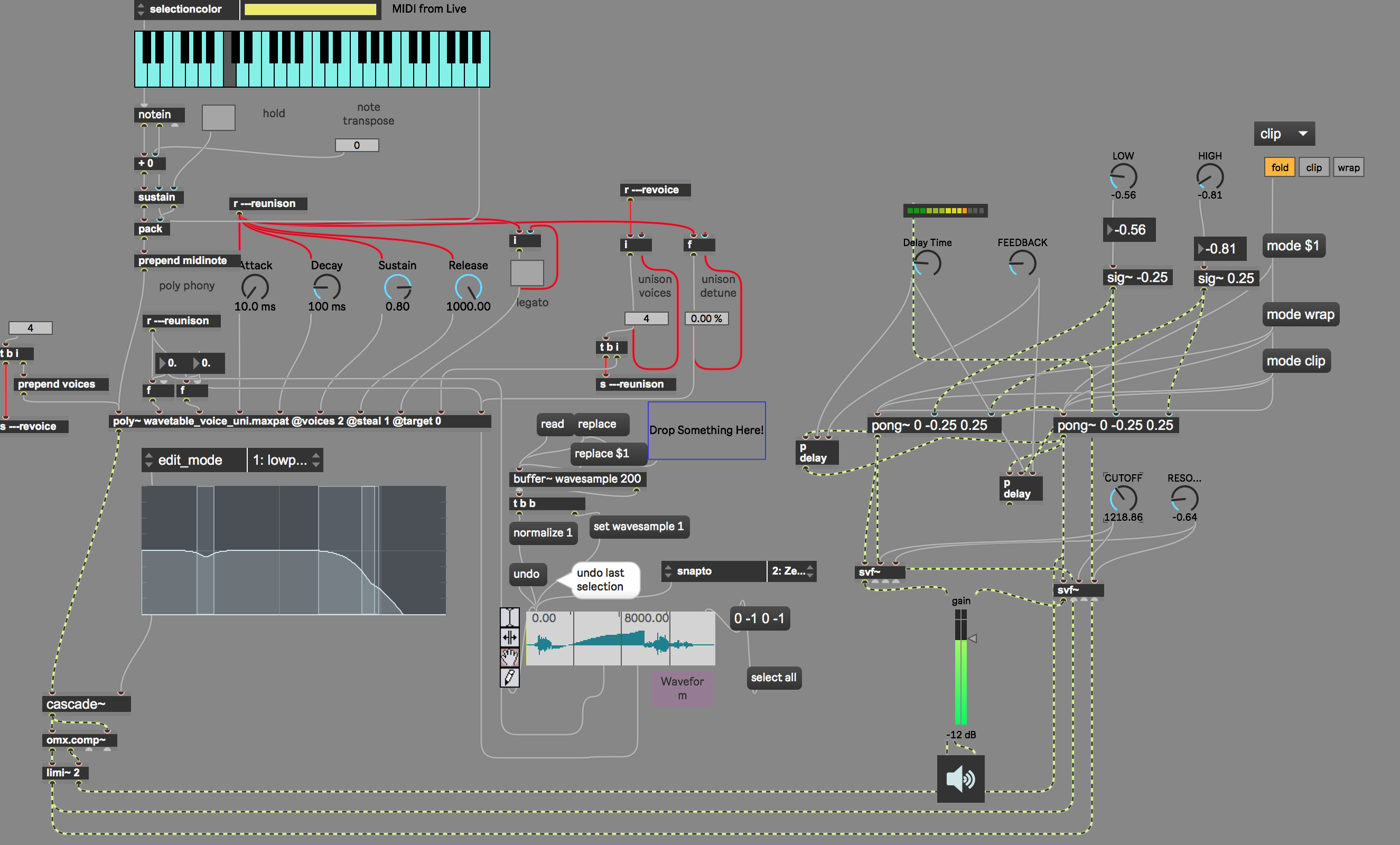 | Description: | This is a wavetable with a folding device. The polyphonic wavetable is created with an audio sample in which a certain area can be chosen and variations can be drawn manually. Furthermore, generell parameters (ADSR, detune, legato, hold, transposition) can be varied. A filter is added. The wavetable is connected to a folding device. The folding device uses the pong element for folding or wrapping its input within a certain range. This can be combined with delay and feedback, a highpass filter and a lowpass filter. More variables are cutoff and resonance. |
