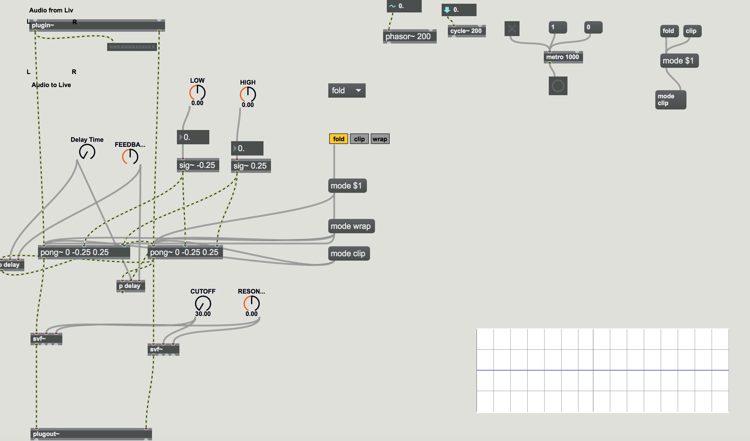 This is a device wich can be used as a effect for live. It uses the pong element for folding or wrapping its input within a certain range. This can be combined with delay and feedback, a highpass filter and a lowpass filter. More variables are cutoff and resonance. |