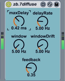 | Description: | zb.7diffuse utilises 7 instances of the zb.diffuse audio effect connected in parallel and series. They are globally controlled by the same 5 parameters. The delayRate parameter controls the frequency of variation of the delay times. The maxDelay parameter controls the maximum delay time. The feedback parameter controls the amount of signal fed back through the delays. The window parameter controls the rate of crossfade between the two delay lines. The windowDrift parameter controls the jitter of the above rate of crossfade. |