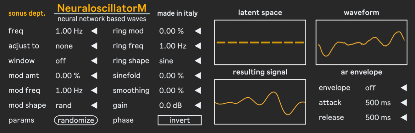 | Description: | Part of Neuraloot bundle, a series of devices build around a custom neural network that generates a complex and evolving waveform. This module outputs the signal of the neural oscillator directly to audio outs, and it can be controlled by MIDI and has an optional envelope, so that it can be turned into a monophonic synth. |