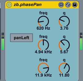 | Description: | zb.phasePan uses three 2nd order phase shifters in series to create a panning effect utilising a non-linear frequency-dependant delay. Based on a switch the signal is panned to left or to the right by inducing phase distortion in the opposite channel. The freq parameters control the centre frequencies of the three phase shift filters, thus affecting the resulting subtle distortion. The q parameters control the resonance settings for the phase shifters. |