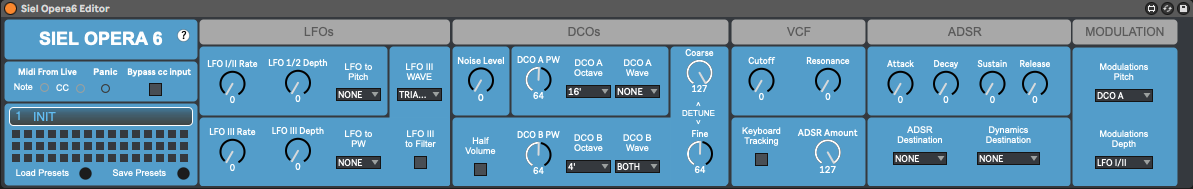 | Description: | This device is as a graphical user interface and a preset manager for the "Siel Opera 6" hardware synth. The Opera 6 needs a specific hardware modification and a Firmware written by Tauntek, allowing it to receive midi cc. For more info and contacts read the "General"-tab in the help (?) section of this device. Features: - remotely control the synths midi functions from Ableton Live - receive and automate midi cc from Opera 6 - store/recall sounds as presets - save/load preset banks to/from disc - Push 2 Support If you like or use my plugins, please consider a donation. https://www.paypal.com/donate/?hosted_button_id=2SNU8YUVU7YCJ Clemens |