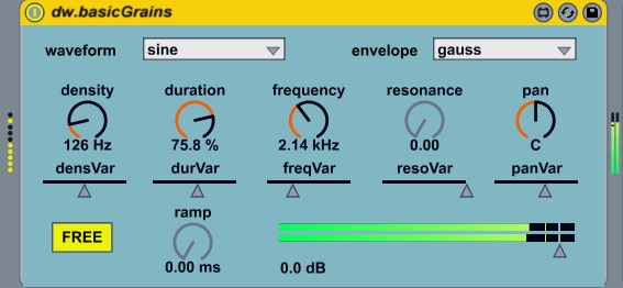 | Description: | dw.basicGrains is a simple granular synthesiser, it can be used for creation of gritty and dense textures. The MIDI/FREE box switches between MIDI input and free mode. In free mode the synth runs continuously and otherwise it resoinds to MIDI notes. The waveform drop-down box selects the type of waveform used for the grains. The envelope drop-down box selects the type of amplitude envelope applied to the grains. The density parameter controls the density of the grains. The duration parameter controls the length of grains. The frequency parameter sets the frequency of the grain signal. The resonance parameter controls the resonance of the grain filter (when using noise as the waveform). The pan parameter controls the panning of grains. The var sliders control random jitter of the above properties. The ramp parameter changes the envelope time (in MIDI input mode) |