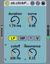 | Description: | zb.clickPerc is a velocity-sensitive, impulse-based drum synthesiser. It uses a state variable stereo filter as well as a duration and curve control for the impulse to create a range of percussive sounds. The duration parameter controls the length of the initial impulse. For low frequency sounds, this should be set to a larger value. The curve parameter controls the exponent of the attack and release curve of the impulse. The LP HP ^ V selector controls the type of filter (low-pass, high-pass, peak, notch) The resonance parameter controls the steepness of the filter, set this to a high value for a sharper, ringing sound. |