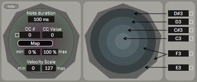 | Description: | Gives four functions to Synesthesia Corp Mandala Pads: - Set note duration - Map CC to other devices in Live - Scale velocity - Set notes of strike zones Setup: Place Mandala Control Center on a separate track and select the Mandala Drum from the drop-down list under "MIDI From" that you want to control. Select the Mandala Drum's assigned CC in order to map it to other objects in Live. Adjust the note duration and velocity. Select the desired output note for each strike zone. Notes can be assigned by manually entering a note as a number (i.e 60), alphanumerically (i.e. C3), dragging the mouse, using automation, or toggling the learn button beside the note box and sending MIDI to the device. The CC # can similarily be adjusted by manually entering a number, dragging the mouse, using automation, or toggling the learn button beside the box and playing the Mandala Pad across the surface. |