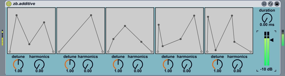 | Description: | zb.additive is a additive synthesiser with 5 harmonics. Each of the harmonics has a separate amplitude envelope. The duration of envelopes is set globally to retain the same length for each harmonic. The tables are used to draw in a custom breakpoint envelope for each harmonic (click to add breakpoints, shift-click to remove them) The detune dials are used to change the tuning of individual harmonics. The harmonics dials control a crossfade between a sine and square wave oscillator for each harmonic independently. Increasing the value of this parameter creates a harmonically richer sound. The duration parameter sets the global duration for all of the breakpoint envelopes. The level slider controls the output volume of the device. |