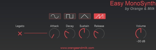 | Description: | Simple mono synthesizer with sine, square, triangle or saw waveforms and ADSR and legato controls. FREE ! |