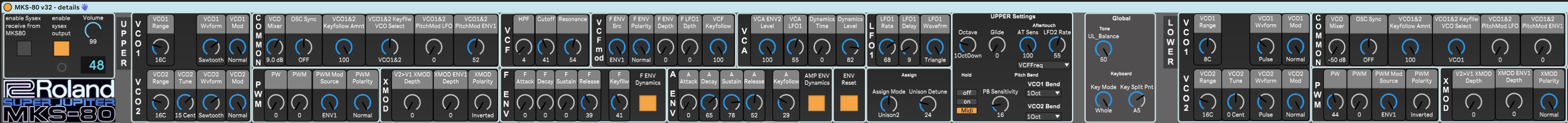 | Description: | This is a maxforlive device for the Roland MKS-80. With it you can control (nearly) every aspect of the, normally Sysex only, MKS-80 from Live. So you can now automate filter cutoff, tweak Envelopes, modulate LFO and fine tune etc. Please be aware that Sysex was not really supposed to do real-time editing. So while you can certainly sweep frequencies etc while playing midi notes, the MKS-80 sometimes stumbles a bit when receiving too much Midi, which can result in a nice swing-y feel, but might not always be intended ;-). I have put in a lot of annotations (the lower left window in Live), especially where a parameter is not immediately understandable (I had to abbreviate a lot of parameters like "V2>V1 XMOD depth"). These annotations are copied from the manual and sometimes edited for clarity. Some information would be too much for the annotation window, in this case I used the pop-up hint to explain, for example for the different Key Modes or Assign Modes. Any parameter that starts with "F" is for the filter, so for example "F ENV Src" is the parameter to select the source for the filter envelope modulation. Anything with "A" is for the VCA/Amp. ALL parameters are mapped, properly numbered and can be automated. I have also put them in the proper order. AFAIK this is the first m4l device for the MKS-80 and I love using it with my rev 5. Changelog: 1.0 initial release (internal v08) 1.1 added Volume control in the GLOBAL section, minor cosmetic fixes, removed most of the initial values. (internal v10) from here on, I'll use the file version, the newest one being v14: fixed known VCO2 Range and and fixed wrong F ENV Polarity assignment v32: now bidirectional!!! :-) Now you can receive a preset from the MKS80, for that the Track the device is on, needs to be armed and of course the Midi input device needs to be set to the MKS80. To receive a patch, enable the "enable Sysex receive from MKS80" button, and then select a preset ON THE MKS80. After the patch is received, the button will turn itself off again in order to not run into Midi Loops. I would also strongly recommend to disable "enable sysex output" while receiving. The devices Dials and controls will now reflect the state of the MKS80. This is a huge advancement but also a little bit weird to use because of the way the MKS80 does(doesn't) support things. Unfortunately the MKS80 does not have an "edit buffer request" neither a way to ask it to send the parameters of a patch when a program change is send. So that's why you have to need to physically go to the MKS80. v35: now with additional Edit Buffer Import. There is a second IMPORT button, which enables sending edit buffer presets to the device. So you can directly send a MKS80 preset from Knobkraft (https://github.com/christofmuc/KnobKraft-orm) to the Maxforlive device, which will update all the dials etc AND SEND the patch to the MKS80. It will also store the preset in the device. So 1 button to receive from the MKS80 itself, another button to receive from Knobkraft. Also fixes to Upper/Lower Balance parameter. And when importing from MKS80 original preset number is shown properly. There is NO preset number when importing from Knobkraft (because edit buffer) v36: recall after saving project didn't work, should now be fixed (change sending format from F0 41 36 (240 65 54) to F0 41 35 (240 65 53) ATTENTION: to be able to use individual dials etc you need to enable "enable sysex output". It is enabled by default. Future Plans: Also published on github https://github.com/markusschloesser/MKS-80_M4L HUGE thanks to "Source Audio" on the Cycling forum for all the help and patience with the device!! Really grateful! If you like the device, you can support me by listening to my music at https://distrokid.com/hyperfollow/markusschloesser/personality-development https://distrokid.com/hyperfollow/markusschloesser/tag-und-nacht |