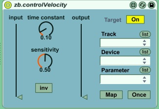 Description: zb.controlVelocity Takes a slider as its input and generates a control signal, based on how fast the slider is moved.