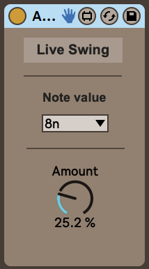 | Description: | Automatically delays incoming notes by a varying length of time to achieve a swing or shuffle effect. Choose what note value you want to base the swing on from the menu, and control the swing amount with the dial. Simple! |