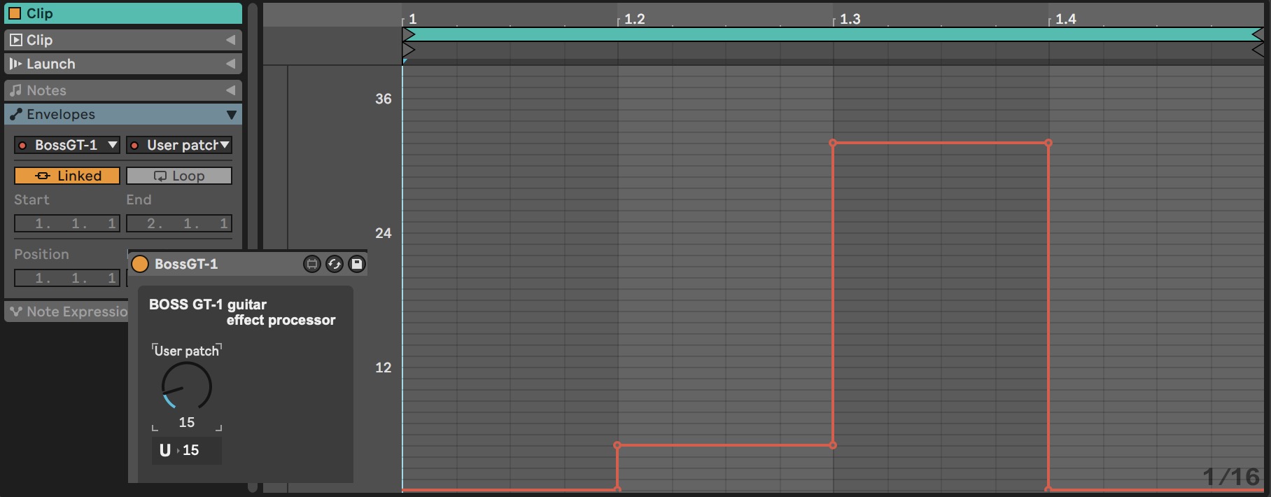 | Description: | User patch selector for BOSS GT-1 guitar effect processor. Useful for automation in live performance environment. !! Should be used with running Boss Tone Studio for GT1 Can be easily modified to work with any other Boss/Roland SysEx device (MIDI System Exclusive messaging). * Use SysEx Librarian and/or MIDI Monitor to capture SysEx (hex) message you need. * Convert message from hex to dec. * Modify MaxForLive device accordingly. P.S. If you want to use variables in your SysEx messages, please google how to calculate Boss/Roland CRC checksum value. The value should be between 1-128 (in decimal). It is the value right before the last value of SysEx message (dec:247 or 0xF7 in hex). |