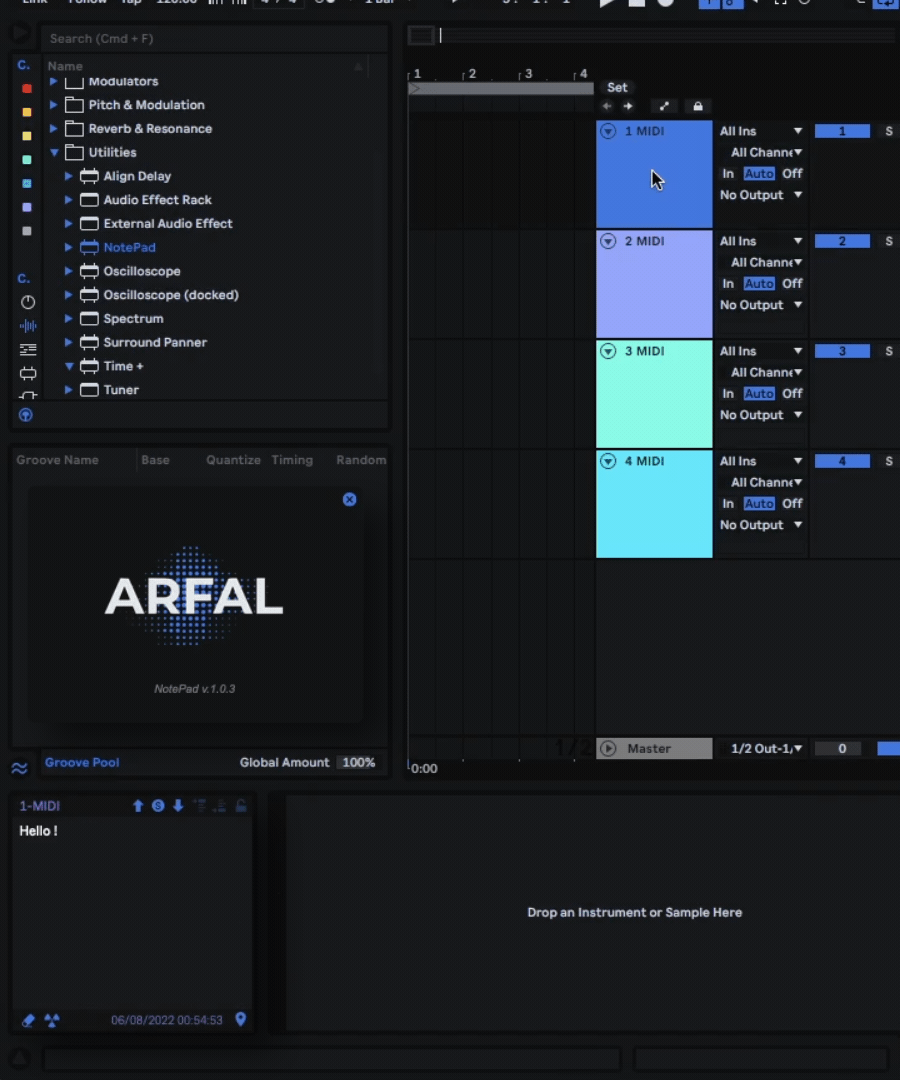 | Description: | Hi ! Here is NotePad ! As its name suggests, (again) "NotePad" allows you to take notes ! As far as I know, it's not revolutionary but there is few things to know about it... The important point is that you’ll need ONLY 1 INSTANCE per session. All you have to do is to load the "NotePad" device on the track of choice, open the floating window and configure his position and his size (it was originally designed to fit in empty, or not so used, boxes of Live, like the groove pool, overview or information ones). Once it’s done you can save it in a template, or as a preset, to avoid doing these steps the next time you'll start a new session. Here is a list of the NotePad features: - Only one instance needed: « NotePad » displays text, the name and the color of the selected track (even Master track). Notes are saved and recalled just by selecting tracks, - Apple "Silicon" M1 compatible, - Floating window: Draggable, zoomable, resizable, integrable in the Live environment, - "Anchored" zoom mode, - 5 presets slots to save and load user settings (mappable for recall), - Autofocus: (thanks to « live.tools » by 11olsen), this avoids having to click twice on the Live window to recover focus, - Customizable colors: You can modify the UI colors (track name, ) of the floating window as you want with the "Color Panel". There an "A" box that make the object color follows the current selected track color, and 3 selectable (only 2 for the Text section) "theme colors" (by default) that you can modify to by grabbing the box and drag it onto the color of your choice, a circle will be displayed to let you return back to the default color, - Select Previous/Next track: allows navigation through your tracks, close to the note to avoid moving the mouse too far between notes. Of course, you can also directly select tracks in your session, - AutoSelect Note: it keep focus on the Note Box when changing tracks with the "Select Previous/Next track" buttons. (If move the mouse out of the NotePad window it will lose the focus), - Erase Current Note: erases the current note associated with your current selected track, - Erase All Notes: erases all note of all tracks in session, - Date & Time display - Locate Mother: allows you to jump in 1 click to the "mother" docked device to make modifications, if you click again, it brings you back to your last selected track or device, - Lock: it keeps active the note of the last selected track before closing the padlock, - Toolbars: can be moved independently on the top or the right side of the NotePad floating window, - Bring to front: brings back the floating window to the foreground, - Push2 optimized. The main purpose of this device is to allow you to take notes quickly with just one instance that you can keep under your eyes when you're working. More than just one page, here you got the whole block :) In your downloaded NotePad 1.xx.zip file you’ll find: - NotePad.amxd - A folder called « Package (Live 11 ONLY) ». Inside this folder you’ll find a video file !!! Installation !!! and a package ARFAL - NotePad. This package permits to integrate "NotePad" in the “Audio Effects” section , in the “Utilities” folder. This is experimental so PLEASE follow carefully the “!!! Installation !!!” video and install at your own risk ! |
