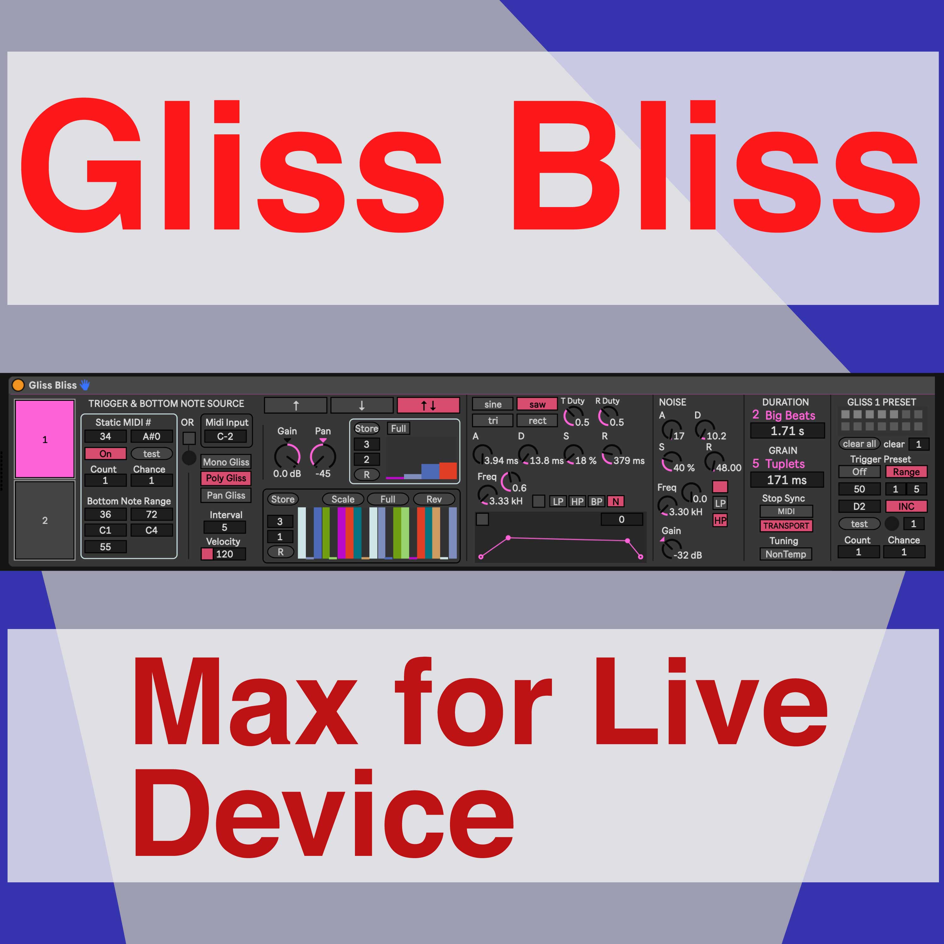 A gliss, short for glissando, is a continuous slide upward or downward between two notes. Gliss Bliss Max for Live Device contains two independent simple synthesizers capable of creating "glissandos." However, although they can produce glissandos in the traditional sense of the word, the real fun is in creating ascending and/or descending runs defined by interval, duration, and grain. |