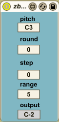 | Description: | zb.brownNote device picks the next note based on a randomly chosen step constrained by the maximum step size parameter called step. The chosen step is taken from the previously selected pitch such that the melodic progression is constrained in pace resembling the spectrum of brown noise. The random walk is based on the drunk Max object, it is constrained in range that can be set with the range parameter. If the step is equal to the range the device will produce uniform distribution i.e. white noise, if larger the extremities of the range will be picked more often. The step parameter sets the maximum step size. The range parameter sets the maximum range of the random walk. The round parameter rounds the note numbers to allow for other uniform step scales other than the chromatic i.e. major second, minor third, etc... The output box serves display purposes only. |