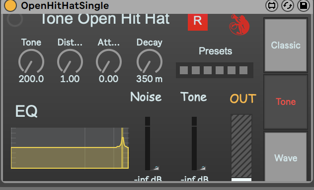 | Description: | Hit Hats - Open & Close - Each with 3 different synth engines, 1 Classic Analog style, noise based, 2- Tone hithat with adds a tone control and 3 - Wavetable synthesis for each hit hat. Percussion synth had a Clap engine, A Cowbell engine and a Wavetable percussion engine. See : https://youtu.be/p2LsM6eQx6o |