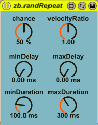 | Description: | zb.randRepeat is a note repeating device. The chance parameter controls the likelihood of a repetition to occur. The velocity of the repeated note will be scaled according to the velocityRatio. The delay before the repetition will be a random number between the minDelay and the maxDelay parameters. The duration of the repeated note is controlled in an analogous fashion. |