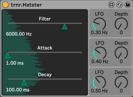 | Description: | Hatster is a unique Hihat synthesizer for M4L with modeled LPG filter/vca behavior and LFO modulation over all parameters. Inspired by modular synthesizers, the noise oscillator core is fed into a modeled LPG filter/vca design which reacts uniquely to each incoming hit - especially when velocity is introduced. All parameters can be modulated with separate integrated sine wave LFOs for even more variation. Changelog: Version 1.1 - Updated UI: visually fits better between stock devices and changes its colors according to the selected theme. Version 1.0 - Initial release |