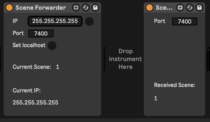 | Description: | Trigger the same scene on 2 machines via UDP network. How to: 1 - Place the Scene Forwarder on a MIDI track of the leader set, place the Scene Receiver on any track of the follower set 2 - Create a MIDI Clip for each slot you want to forward on the MIDI track hosting the Scene Forwarder 3 - When a clip is_fired its slot index will be sent to the Scene Receiver and fire the correspondent scene Set IP of the receiving machine (leave 255.255.255.255 for broadcasting on all IPs). Set the same Port for both devices. Ports and UDP connection must be unrestricted by any firewall/router. If it doesn't work check your network/router settings. Works well with some global quantization and Link, if global quantization is set to none, expect network latency. |