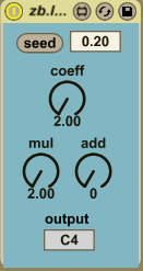 | Description: | Two basic recursive algorithms are zb.moduloRecursion and zb.logistic They both alter the pitch of incoming notes. The zb.logistic device implements the logistic equation that has a single coefficient that drives the system from fixed value through oscillatory into chaotic behaviour. Both devices have mul and add parameters to fix the output range, also they can be reseeded at any moment using the seed buttons which will restart the recursion with the specified value. Gray output boxes are used for display purposes. |