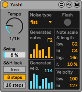 | Description: | Yash! stands for "Yet Another Sample & Hold", and it is based on the amazing schematic/module design by René Schmitz. This design is so simple, so easy to build, yet, so usable, that I have built a whole bunch of these in Euro and in Serge format; super simple to build, even on a small piece of stripboard. A classic sample & hold module needs a trigger and a source to sample; in this M4L version, the trigger is a clock, synced to Live (with swing) and the sample input is a collection of different noise types, like flat, 1/f, 1/f2, f, f2, crackle, gaussian and even an MM5837 noise chip emulation. Why? With sampling from different sources, you'll get different "taste" of MIDI note streams. After sampling, you can lock the internal shift register into 8 or 16 steps loops, then, you can scale the output. Internally, there are 2 "circuits", one for notes and one for velocity. With the (MIDI mappable) "flush" button, you can open the sample input temporary; you can let "new source" to sample flow in. Please note, just like any other sample & hold, Yash! doesn't have a "memory cell"; you have to record the MIDI output onto a channel, otherwise your random melody is gone after re-loading the session. Yash! is great for "jamming", recording random loops from synths or browsing through patches, presets. If you are interested more in René's circuits, visit his website; super amazing work! http://www.schmitzbits.de Version history: 1.oo - release 1.o1 - 16 step lock bug fixed, thanks Matt! 1.o2 - dynamic UI + user request (API mapping) implemented 1.o3 - minor UI update 1.o4 - Live 12 compatibility check |