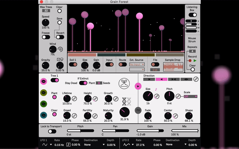 | Description: | Grain Forest is a granular synth+effect driven by a simulation of a forest that evolves through DNA mixing and mutations over generations. Each tree in the forest is an independent grain or voice that has its own DNA which modulates the grain's playback and FX parameters depending on how you set up that tree species (up to 4 species). Pollen from trees can mix DNA with another tree and create a new seed, optionally with mutations. The trees sample audio and grow from the "soil" beneath them, each soil type can have its own unique audio mix coming from various audio sources. This all adds up to a literally evolving soundscape sampled from multiple audio sources! Grain Forest can be a granular delay, a texture, a glitchy/chaotic effect, a dynamic sampler, or whatever way you figure out how to use it. Teaser Video: https://www.youtube.com/watch?v=4nDodMugTKs Walkthrough: https://www.youtube.com/watch?v=EiTRe07xt4c FEATURES: - An evolving forest simulation with various parameters to control it and for triggering granular playback - Up to 4 unique audio source mixes (Soil) for the trees to sample from. Each mix has independent settings for: --- 3 audio source options that can be mixed together: audio input feeding directly into the device on the track chain, audio routed from another track in ableton, and a dropped audio file that can be repitched - Up to 4 species of trees. Each tree species has independent settings for: --- How it grows, survives, and reproduces --- What sound source (soil type) it can sample (eat) as well as an option for only eating certain notes on a keyboard --- Granular playback: direction, grain size, pitch (with scale options on genetic variances), fade window --- FX: filter (biquad and ladder), delay, gain, and pan Genetic variance (modulation or CV amount applied to its DNA) for most of the parameters - 2 LFOs with perlin noise options - Master mix - Option for custom tree top visual (by dropping image files into the device) More: Dillonbastan.com dillonbastan@gmail.com |
