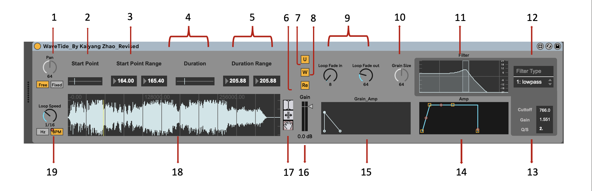 | Description: | WaveTide is a polyphonic virtual granular synthesizer designed and developed entirely by me, using Max for Live. It divides a sample into small grains then rearranges and loops it to synthesize new sounds. It’s a powerful polyphonic synth that supports playing up to 16 notes at once. It has basically all the functions of those mainstream granular synthesizers on the market, as well as its own comparative advantages. For example, WaveTide supports adjusting the amplitude of the grains in detail and selecting a range that can randomly generate the start points and durations of the grains. By the way, all three selecting tools on the left are corresponded, and thus can be either visual or precise. The expanded function area on the right is presented in a visual and interactive way, and most of the parameters in this device can be automated. This endows users more freedom to create new timbres and sound effects. Function introduction(See the screenshot): 1) Global pan for this device. It can be locked and adjust the output’s position in the stereo field or switched to the “Free” mode, at which every grain could have a random pan value and create a colorful stereo effect. 2) Start point range of every grain presented in a rslider object. Click and drag left/right to select the range or a certain point. The device would randomly select a start point within the range. 3) Start point range of every grain is presented in a number box object, which can be separated and precisely adjusted and automated. 4) Duration or length value range of every grain presented in a rslider object. Click and drag left/right to select the range or a certain point. The device would randomly select a duration value within the range. 5) Duration or length value range of every grain presented in a number box object, which can be separately and precisely adjusted or automated. 6) Turn on/off the reverse mode of grains’ playback. 7) Unfold device parameters which include all the parameters on the right. 8) Window editor switch which turns on/off the amplitude control of grains. If the switch is turned off, this device will apply a Gaussian curve to modulate the amplitude of grains. 9) Adjust the fade-in and fade-out value of the grain’s amplitude while looping, which can be helpful to reduce possible clicking sounds. 10) Adjust the duration of the Gaussian curve which presents the grain size while the window editor switch is turned off. This parameter is inactive when the window editor switch is turned on. 11) Graphical filter editor which can control the cutoff, gain, and Q/S values of the filter. 12) Filter type selector, which can select from 9 different types of filters. 13) The cutoff, gain, and Q/S values, which are presented in number boxes. They can be automated. 14) ADSR user interface which controls the global amplitude of this device. Click and drag to control the ADSR parameters. 15) Break points function editor which controls the amplitude of grains. Click and drag to create special curves freely. This could only be active while the window editor switch is turned on. 16) This adjusts the overall level of the instrument. 17) Toolbar to switch between three operating modes of the waveform window: selecting a range, moving the range, and zooming in/out. 18) Waveform window to show and edit samples. Drag samples into it and select a start point range or a fixed start point by clicking and dragging. This object works together with the toolbar on the right. 19) Adjust the loop speed of the grains. It has a sync switch that sets the looping speed in hertz or synced to the song’s tempo. |