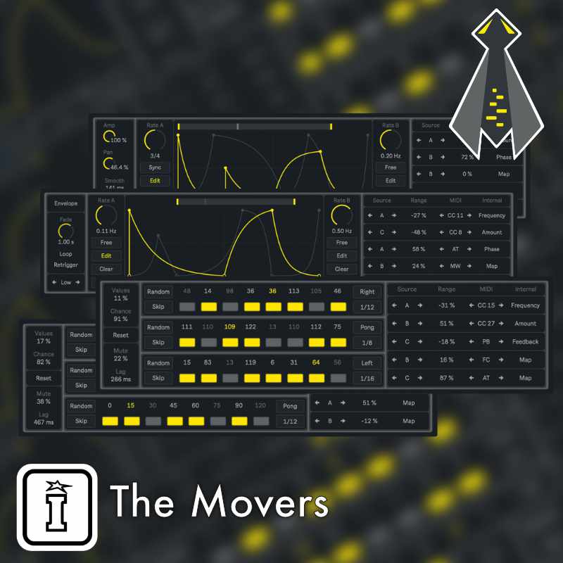 | Description: | THE MOVERS The Movers features four paired Max for Live devices, designed as control tools for both Live and external parameters. Add expression by easily targeting single parameters inside your Live set, or give these modulation sources any of the available MIDI message formats and take control over other external instruments. Functions Functions is a versatile control device, designed as a dynamic modulation source for both Live and external parameters. Integrated by two editable waveforms, it could be played both as a classic LFO, or a complex envelope, being triggered by incoming MIDI notes. These modulation sources are distributed at will between five output layers, each assigned either by individual Map buttons, or by sending out any of the available MIDI message formats: Control Change, Pitch Bend, Modulation Wheel, Foot Control or Aftertouch. The audio effect version of Functions works almost exactly the same, with the only difference being that it cannot be triggered by MIDI notes nor sent MIDI control information. Instead, both sources could be applied over the audio input signal, offering different ways to modulate its amplitude level and panning position. Ministeps Ministeps is a simple and useful control device, also designed as a modulation source for both Live and external parameters. Control values coming from the three integrated sequencers are distributed at will between five output layers, each assigned either by individual Map buttons, or by sending out any of the available MIDI message formats: Control Change, Pitch Bend, Modulation Wheel, Foot Control or Aftertouch. Ministeps is composed by a pair of devices, where depending on each case, either the MIDI or the audio version of this effect could be more useful than the other. Nonetheless, both alternatives present the same characteristics, with the only exception being that no MIDI options are included on the Ministeps audio effect. |