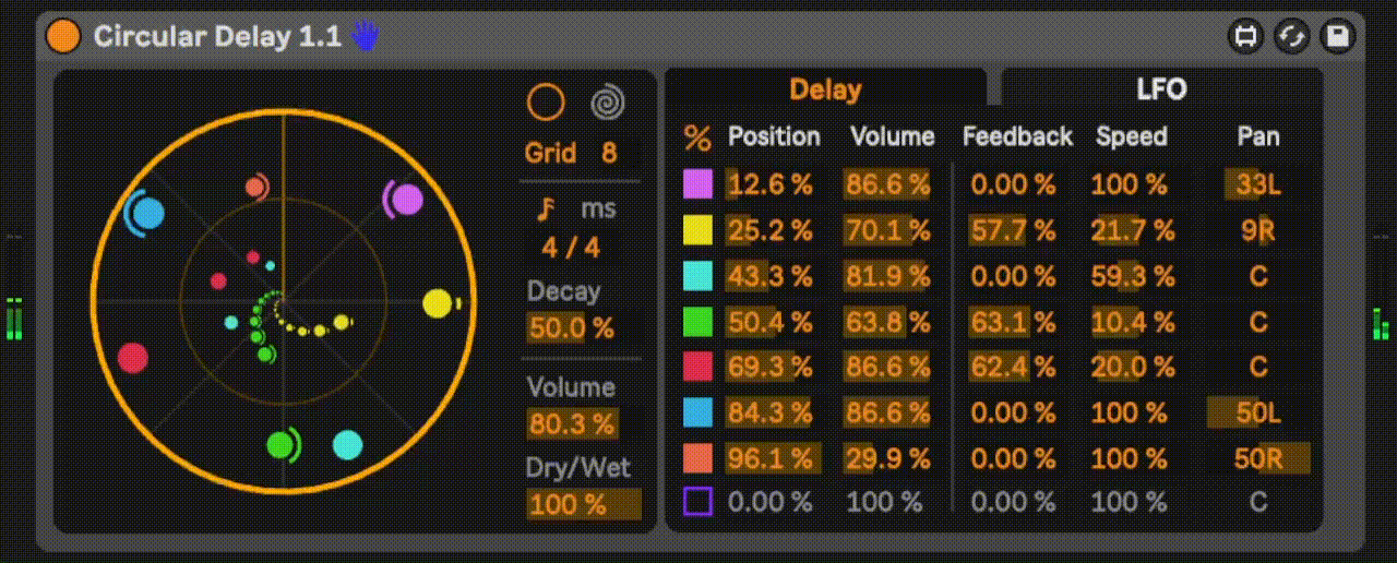 | Description: | Circular Delay is a m4l multi tap delay device. With this device you can have up to 8 different delays with a very clean visual representation of the delays AND the incoming audio. The circle will show the intensity of the incoming audio and you can customize the time it takes to go around the circle, in seconds or in beats. There's two modes for the circle: single (the audio only goes around the circle once), or infinity (the audio will keep going around the circle, decaying each time the amount desired. So all the delays can have another global feedback). You can customize every single delay with its position, volume, feedback, and a unique "feedback speed" which is another delay tap only for the feedback, so you can have a very long delay but with a very fast feedback (don't worry, it's very easy to understand thanks to the visual representation every delay and feedback repetition has). The position and feedback speed can be set in %, in ms, or in beats. On top of that, there's an LFO section where you can modulate any parameter of every delay with different waveforms, speed, and amount. And, of course, a wet/dry and a volume (wet signal only) controllers. Video teaser: https://www.youtube.com/watch?v=miRoQMfwhvE Feel free to contact me at UdoRBrauna@gmail.com for any questions, problems or requests. min Live version tested: 10 min Max version tested: 8.2.1 ------- Updates: Version 1.1: - Fixed minor visual things (font colors, inactive box colors, etc.) - Fixed a bug with the feedback speed when set to "Note values". - Added a grid option. You can set the division of the grid. - Added a "pan" knob for each delay (LFO can modulate it), and a visual representation for the pan. - Added an "offset" knob for the LFO. - Dry/wet knob now is equal-loudness. - Fixed audible clicks when changing the values of the delay. - When the delay is set to beat-mode, now you can't set a value greater than the circle time. |
