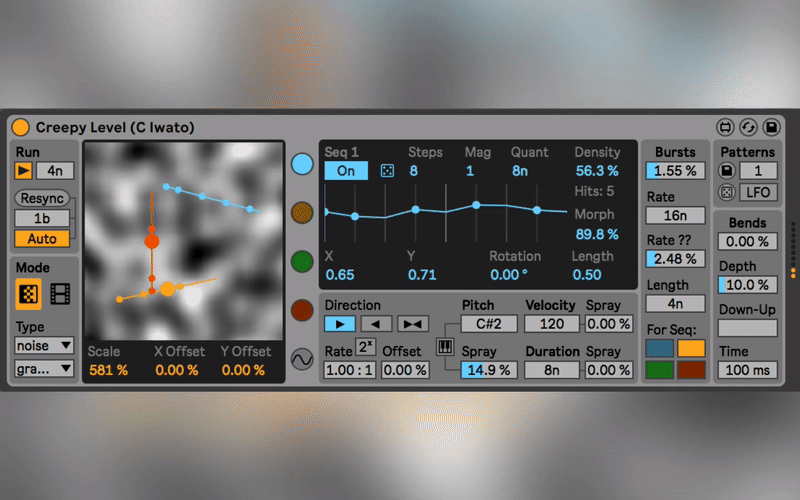 | Description: | Rhythmorphic creates NON-euclidean sequences by morphing sequences with an image source (can be a video, generated texture, live camera feed). The four morphing sequencers allow for more complex and organic rhythms than standard euclidean sequencers provide (there are certainly enough euclidean sequencers! although this can be used as one if desired). There are various options for changing the output MIDI note, scale options, and modulating just about everything for the sequencers and image settings! Check out the features below or in the walkthrough. TEASER VIDEO: https://www.youtube.com/watch?v=E7Xy7rPtZFs WALKTHROUGH: https://www.youtube.com/watch?v=mFrhJ0KcqzQ FEATURES: - Main visual display with mouse interaction - Image source options: --- texture generator --- dropped image/video files --- live camera input - 4 sequencers --- Randomize function --- # of Steps, hit density, step offset --- Ability to mix between plain euclidean sequence and morphed non-euclidean sequence --- Smart quantization (to clean up faster rhythms while maintaining the sound of the pattern) --- Morph magnification --- MIDI note out options with optional random spray --- Scale and tonic options including one for Drum Racks --- Playback directions --- Independent speed scaling - Random note burst repeats - Random pitch bend envelopes - Randomize function - Pattern snapshots for all sequencer settings --- Allows for switching between complex rhythms --- Patterns can be modulated with the internal LFO the internal --- LFO settings can also be stored into pattern snapshots! MORE STUFF: dillonbastan.com CONTACT ME: dillonbastan@gmail.com |