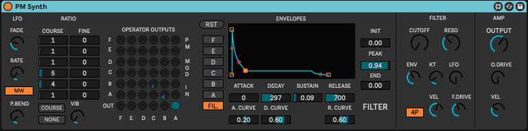 | Description: | Phase Modulation (PM) is the technique that is actually used most commonly by "FM Synths". This synth is intended to augment (not replace) Operator. With 6 operators and a full mod matrix, it offers quite a lot more routing flexibility than Operator. However, the CPU use is pretty high with higher counts of polyphony (I capped it at 8 voices), and it doesn't have the nice additive engine that Operator includes. A note of the mod matrix: Columns represent the output of each operator. Rows can be thought of as inputs, with rows A-F being routed to this operator's PM input. The bottom row is the is the output of this voice, so mapping an operator's output to this row will tap this as an audio output. A word of caution: The diagonal (starting from the top left) will create feedback loops by mapping an operator's output to its own PM input. Be careful with the level, as going above 30% can get a bit out of hand. Also, higher levels of modulation are more prone to aliasing, especially when the course ratio is up, or playing in a higher register. There is oversampling baked in, but it doesn't completely alleviate the aliasing. Most features should be pretty self-explanatory, but I anticipate some confusion around the MW and AT toggles. When the former is engaged, the mod wheel will increase the LFO frequency from where it is set on the panel. The latter will modulate the LFO depth with aftertouch. Usage: I have included the abstraction files in case there is any complications or compatibility issues loading the device on different systems. That said, you should only need to load in the "PM Synth.amxd" file to access the device. I hope people enjoy this synth! If you like what I am doing, please consider supporting me :) |