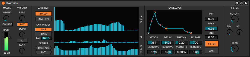 | Description: | This is an additive synth behemoth. 64 partials, each with its own ADSR envelope that can modulate amplitude, phase, or panning. Each of the 8 voices also has an amp and filter envelope and LFO. I will save you the trouble of the head-math... this is a total of 512 oscillators and 520 envelopes. Needless to say, it is a little (a lot!) taxing on CPU. The filters are clean resonant LPF's, in part because I felt it best suited the voicing of this synth, but also because analog modelled filters would demand more CPU cycles than I thought we could spare. There is an incredible level of control, but with the fader banks, it is easy to quickly sculpt complex sounds (especially formant). That was the motivation of creating partials :) If you are ever unsure what a parameter does, I have included tooltips for everything than can be read in the Ableton "info view" (bottom left corner). |