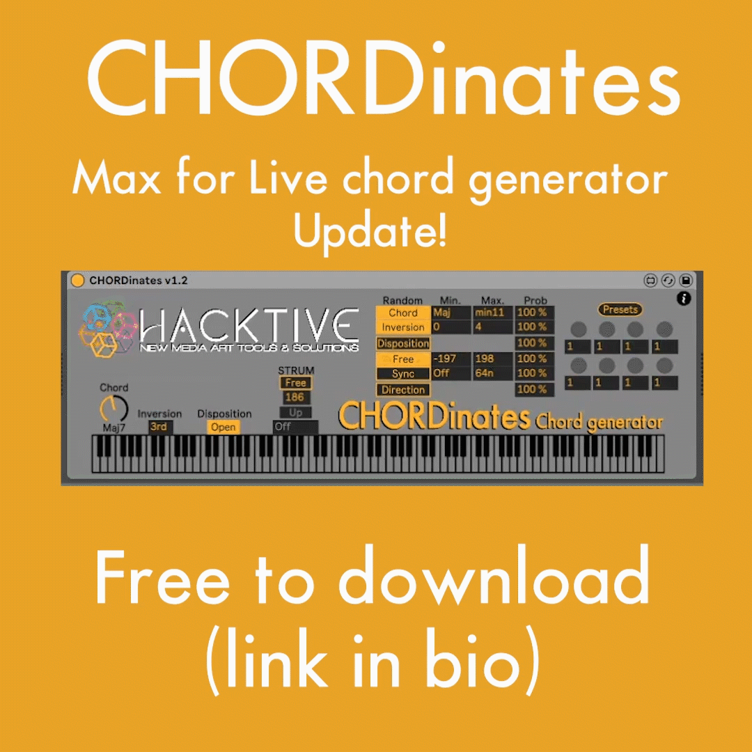 CHORDinates is a MIDI device that generates chords out of individual MIDI notes. You can choose from up to 20 different chord types. You can randomize all its parameters for more variation and fun.