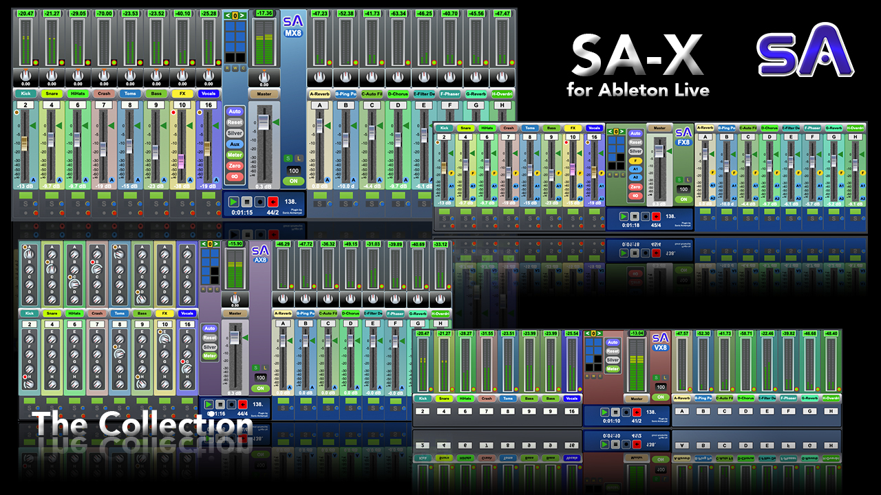 | Description: | SA-X Series Floating Mixer Collection (8, 16, 24, 32 or 48 tracks) Simpler. Faster. Even more efficient workflow. Now include Relative faders for Touch Screens Welcome to the SA-X Series Floating Mixer Collection for Ableton Live IMPORTANT NOTE: The SA-X Series requires Max For Live 7.0 + BEST BUY: SA-X48 will get you all 20 plugins ~New Features in 2.3~ The SA-X Version 2.3 sees a complete rebuild. The upgrade may not look much, but the changes are huge. Under the hood this version has been completely rebuilt. The SA-X plugins are much faster and more responsive. MIDI Mapping I have implemented a simpler, faster and more reliable MIDI mapping method, removing the need for the StudioLive MIDI mapping switching. There were some MIDI mapping issues with Ableton 11+ that have been addressed in this upgrade. ~ Updates ~ Track Data Flow Track data flow engine has been completely rebuilt for faster and smoother response. MIDI Mapping MIDI mapping and external control have been rolled into a faster more efficient system that works more reliably. MIDI Mode: StudioLive The StudioLive function in previous versions has been removed with faster and smoother MIDI mapping functionality. Auto Load Button The Auto load button action has been revised to decrease load time. Presets Presets load faster and can be more easily controlled from and external controller. Saved presets will be loaded when a project is reopened in Ableton. Solo Reset and Arm Reset Buttons Solo Reset and Arm Reset Buttons can be MIDI mapped. Information Window Now includes update information. Track Pan Displays pan L-C-R numbers. Group Track Display Group tracks are now clearly indicated. ~~~~~~~~~~~~~~~~~~~~~~~~~~~~~~~~~~~~~~~~~~~~~~~~~~~~~ ~ Introducing the SA-X Series ~ The SA-X is a collection of 4 customizable Max4Live plugins for Ableton Live that gives you a fully functional floating mixer, fader only mixer, meter bar and Aux Send mixer; enabling you to have the mixer functions available in the arrange window, or open on another screen. SA-MX : Mixer SA-FX : Fader only mixer SA-VX : Meter bar SA-AX : Aux Sends and Returns mixer The SA-X comes in 8, 16, 24, 32 or 48 track versions. Each track has 8 Aux Sends. ~ Purchasing Choices ~ BEST BUY: SA-X48 will get you all 20 plugins Depending on the version that you purchase, you automatically get all the smaller versions, which enables you to choose different size projects and requirements. eg. If you purchase the SA-X24 you get the 8, 16 and 24 track versions; thus 12 plugins. ~ Features of the SA-MX, SA-FX, SA-VX and SA-AX ~ Layout Tracks: 8, 16, 24, 32 or 48 Aux Sends: 8 Return Tracks: 8 Window Scaling: 50 - 100% Linear / Stacking modes: Switch mixer between a linear or stacked layout for monitor space saving (24, 32 and 48 tracks versions). Float Mode: Enables the floating SA-X to be opened and closed between virtual desktops. Controls Transport Controls: Play, Stop, Record, Automation tracking. Project Information: Clock / Tempo /Bars & Beats Auto Track Select: Fill the mixer automatically with tracks from your project. Custom Track Select: Select the tracks you want in the mixer. Track Color Switch: Project colors or silver Track Selection Reset: Clears all channels in the mixer removed selected tracks. Global Controls Fader Zero Reset: Sets all track faders to zero dB. Fader - ∞ dB Reset: Sets all track faders to - infinity. Meter On/Off: Switches all the tracks meters on or off. MIDI Mapping Control the mixer from your external MIDI Controller. Snapshots & Presets Speed up your workflow with mixer snapshots and presets. Track Details Track Name Selection: Select the track using a drop-down track name list. Track Number Selection: Select the track using the project track number. Meters: Displays the VU and Peak track levels. Meter On/Off {Freeze}: Switch on and off (freeze) track meters. Pan: Pan track audio left and right Volume Fader: Control the volume level of the track. Fader Zero Reset: Reset the volume fader to 0dB. Track Activator: Switch the track on and off. Solo: Solo the track. Global Solo Reset: Un-solo all tracks that are soloed. Record Arm: Arm the track. Global Record Arm Reset: Un-arm all tracks that are armed. Ableton Current Track Selector: Select the track in Abelton and jump to it in the session view. Automation Indicators: Show tracks that automation in them, and tracks with automation over-ride. Automation Reset Buttons: Resets all tracks back to automation from automation over-ride. ~ Software Requirements ~ Ableton Live 9.0 + Max For Live 7.0 + ~ Hardware Requirements ~ These plugins were all built and tested on a 2012 Mac. They should work quiet happily on any hardware newer than that. :) ** Additional Information ** ----- 2.2.1 Updates & Fixes ——— ~ Updates ~ Plugin Float Mode Relative fader values Desiged to now work seamless with touch screen. Ableton Current Track Selector and Grouped Track Selector Select tracks in the project even if they are in an unfolded group. Return Track Selection Return tracks can now be selected as well ~ Fixes ~ MIDI tracking is bi-directional If changes are made in Ableton directly while in Live MIDI mode, those values are reflected back to the SA-X Live MIDI mapping mode on PC’s The faders now work correctly on the PC when in Live MIDI Mode Meter button on/off Meter ON/OFF indicator is now displaying correctly when the plugin is loaded, and the Meters are off to save CPU. ----- 2.2 Updates ——— Track Faders Relative Values This allows for smooth control using touch screens. Snapshots and Presets Snapshots and Presets combine to expand the versatility of the SA-M. They enable multiple mixer configurations, that can be saved as presets. The presets can be loaded into the current project any other Ableton project. Snapshots A Snapshot stores the current mixer configuration: the tracks and return tracks that are currently in the mixer. The SA-M can have 8 snapshots. Presets Each Preset co
