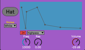 | Description: | Hi, This is a Hi Hat instrument made from a Noise Source. This can be either White or Pink Noise. The noise source goes through a filter. You can control the Frequency as well as the Resonance. In addition, there is a drawable Amp Envelope. You can drag the points up or down. Click anywhere to add a point. Shift-Click on any point to remove it. I recommend always having the last point at zero (bottom right), otherwise it will continue to sound. Press the Hat button to hear what it sounds like. Enjoy. Update: Hi, I went a bit crazy and added selectable 12 or 24db slopes to the filter. Additionally, the filter can now be Low Pass, High Pass or Band Pass. Update: I decided to make the Duration selectable by Key. C plays 128n, D plays 64n ... B plays 2n. |