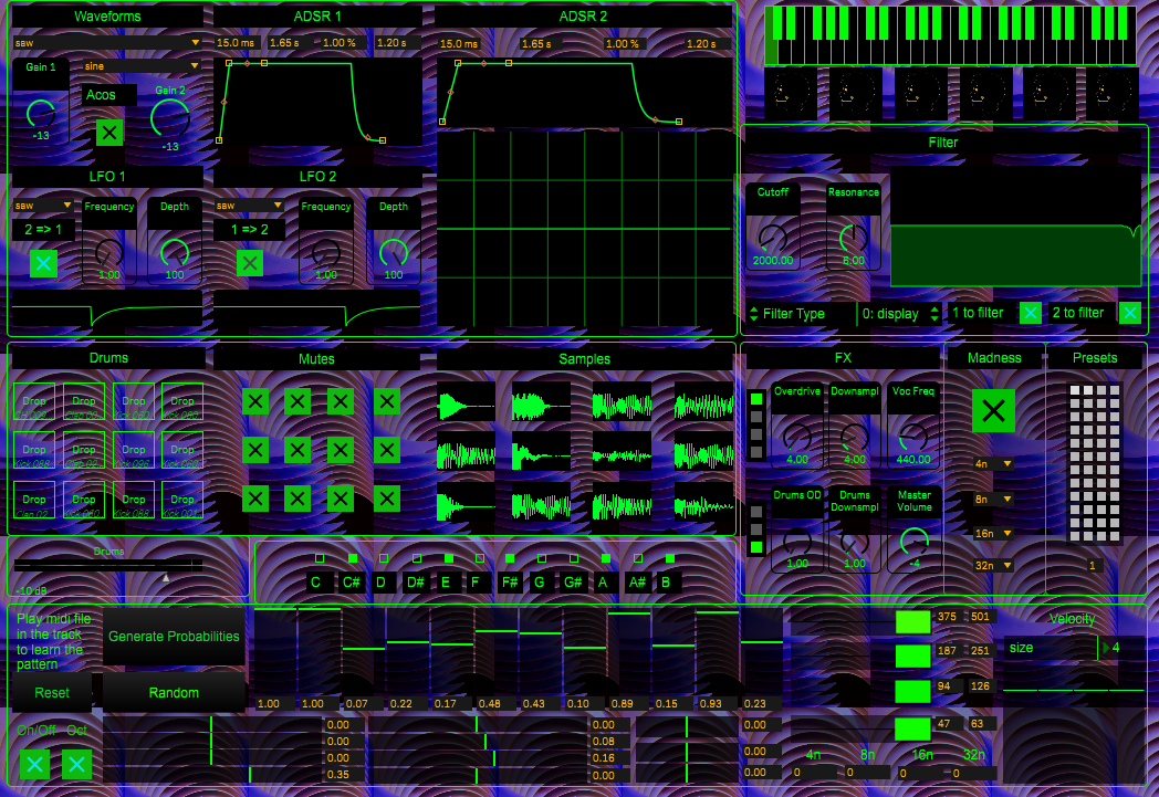 | Description: | Simulation Synth for Ableton Live -Five polyphonic oscillator waveshapes on board plus three monophonic monofonic -Two lfos, adsrs, filter block and fxs - all is randomizable -One-shot drum rack -Built-in probability sequencer with bug fixes How to use: Just like any other synth. Adsr setting is the key. Randomize option is available and after some tries gives good sonic result. Probability Sequencer for Ableton Live -Learning on any sequencies -Chorder behaviour -Probabilistic octaver -Duration variation and easily controlled note expression How to use: It has four blocks. Each block can function in random mode or learn from existing sequence. The first block is the analyser. It can learn on sequence played inside the track where plugin is placed and generate notes and octave probabilities. The second block is notes’ cumulative probability graph. It can be used as chorder as well. If each step is higher than the previous then each note plays once at one step. If one of the subsequent notes is lower than the previous there may be more notes playing together in one step. The third block is octaver. It operates by the same logic as notes block. In random mode only four mid octaves are affected. The fourth block is note expression. It consists of notes’ intervals and velocities. The sliders here controls the time in milliseconds for analysis of sequences in different tempos ranging from 120 to 160 bpm (these parameters are irrelevant in random mode). The probabilities of four intervals control their occurrence in the output sequence. Some “madness” can be turned on to add variety to each forth of twelve steps so that notes in a chord has different durations which is especially useful for random generation. Velocity is analysed a table form. All velocities of input sequence are stored in the table and occur at random order for each note played. In random mode only 9 velocities are generated in the table. At last, all settings can be stored in preset and recalled. |