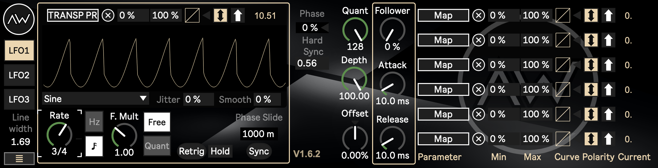| Description: | Introducing MultiLFO: Unleash Your Creative Potential with Enhanced LFO Capabilities! Experience the power of MultiLFO, an incredible evolution of Live's LFO device. I’ve packed MultiLFO with a host of exciting new features, giving you unparalleled control and flexibility in your workflow. Let's dive into what MultiLFO brings to the table: 1. Triple the LFOS, Triple the Possibilities: Say goodbye to limitations! MultiLFO boasts not one, but three independent LFOS, each with its own unique characteristics. Seamlessly switch between them with the convenient selector, allowing you to explore endless sonic landscapes. 2. Self-Modulation for Mind-Blowing Shapes: Prepare to be amazed! MultiLFO introduces self-modulation capabilities, enabling for exampleLFO2 to control the speed of LFO1. Unleash a world of weird and wonderful shapes, taking your sound design to new heights. 3. Boosted Sine LFO: I’ve supercharged the Sine LFO by adding a hard sync parameter. Now you can interrupt the sine wave in the middle of a period or fit more sines into one period, opening up a world of rhythmic possibilities. 4. Pulse Width Control for Square LFO: Take control of your steps! MultiLFO introduces a pulse width parameter for the square LFO. Adjust the duration of each step, allowing for shorter or longer bursts of modulation at maximum value. 5. Envelope Follower for Dynamic Modulation: Introducing the envelope follower, a game-changer in dynamic modulation. Trigger the LFO based on input volume or a sidechain, with configurable attack and release settings. Experience the magic as your sound comes to life in response to your playing. 6. "Drunk" LFO Modes: Get ready for controlled randomness! MultiLFO offers "drunk" LFO modes, delivering random values with small, subtle movements. With the follower engaged, you can choose to follow the envelope from the middle value or from zero, providing even more creative possibilities. 7. Gaussian Drunk Mode: Add a touch of unpredictability! The Gaussian drunk mode generates regular small jumps and occasional big leaps, all with a customizable amplitude. Embrace the unexpected and let your creativity thrive. 8. Fine-Tuned Random Mode: Explore the full spectrum of randomness! MultiLFO introduces a specific random mode that allows for smooth morphing between complete randomness and a more structured Gaussian random pattern. Tailor the distribution of values to suit your needs. 9. Extended Rate Range: Break free from limitations! With the LFO rate multiplier, you can achieve higher rates beyond the original 40 Hz. Push the boundaries of modulation speed and explore new rhythmic territories. 10. Personalize Your Sound: Embrace sonic transformation! MultiLFO introduces per-parameter transformation curves, offering logarithmic to exponential options. Shape your sound with precision and create unique textures. 11. Enhanced Binary Mode: Fine-tune your triggers! Binary mode allows you to select how often 1 values are triggered, giving you precise control over modulation patterns. From never to always, the choice is yours. 12. Intuitive Display Enhancements: I’ve revamped the LFO display to provide a more accurate visual representation. The graph now takes into account the min, max, and curve values of the first target parameter, ensuring a clearer and more intuitive experience. Adjust the display line width to suit your preferences. 13. Smoothing Perfection: MultiLFO takes smoothing to the next level. Enjoy control over a full period of the LFO, providing seamless transitions and eliminating abrupt changes. Fine-tune your modulation with precision and finesse. 14. Intelligent Syncing: Say goodbye to phase jumps! The LFO in sync mode will always strive to maintain synchronization, without any disruptive phase shifts. This feature is especially useful for modulating filter jumps while ensuring a smooth transition back to sync. Adjust the phase slide parameter to control the speed of resynchronization. Need instant sync? Simply press the SYNC button for immediate quantized synchronization. 15. Quantization : I’ve added that missing feature that will allow you to downsample the output values from full resolution to a mere min/max jump for nice sounding stepped jumps of the modulated target. 16. Streamlined Performance: I've worked tirelessly to optimize MultiLFO's CPU usage without compromising on its incredible feature set. Enjoy the enhanced capabilities of MultiLFO without any additional overhead. It takes only around three times the resources of a normal LFO, ensuring a seamless and efficient experience. Experience the next level of modulation with MultiLFO. Elevate your sound design, unlock new creative possibilities, and take control of your music like never before. Get ready to shape your sonic landscape with precision, finesse, and boundless creativity. |