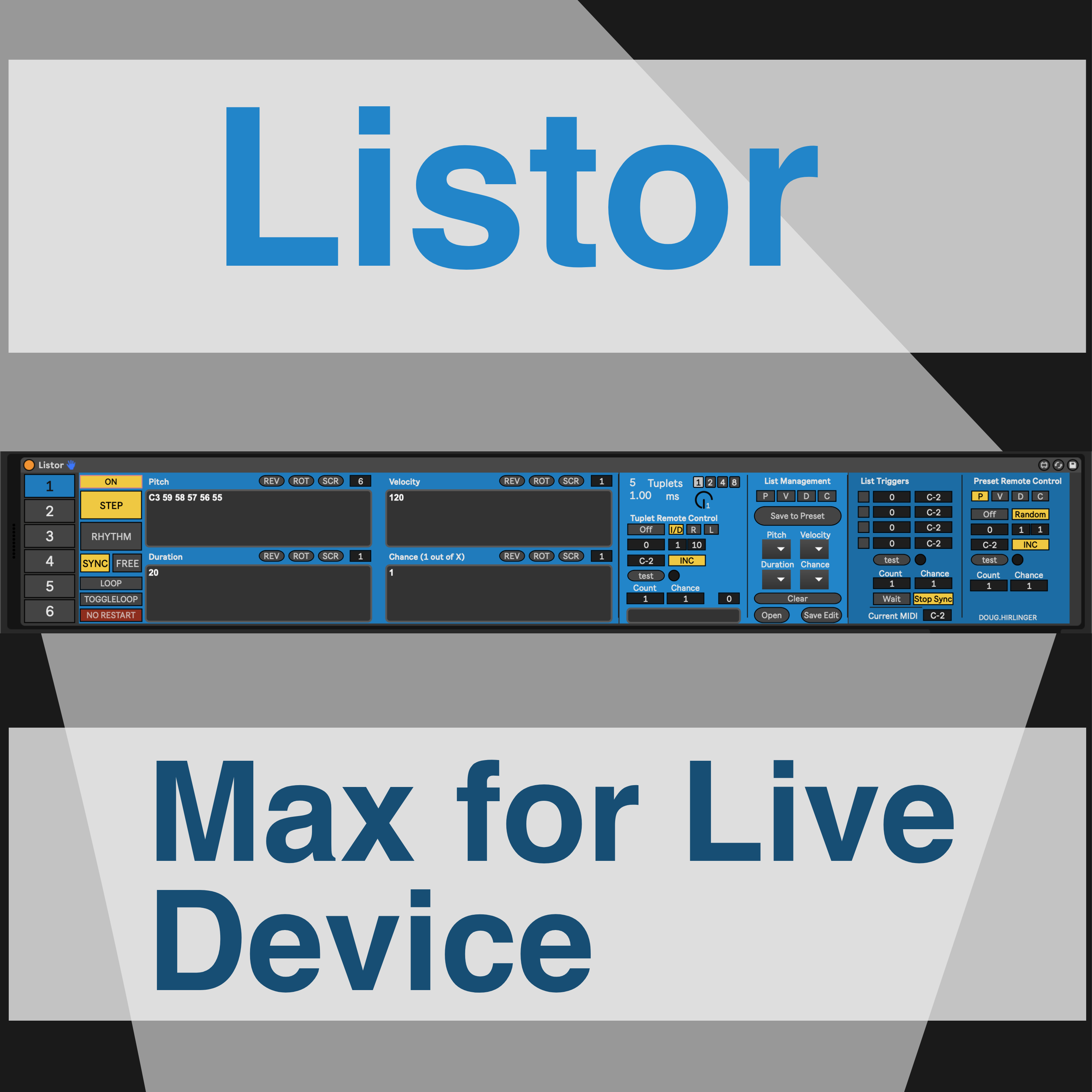 | Description: | Listor is a powerful tool for live performance and music creation in Ableton Live. Create 4 grouped but independent lists of pitch, velocity, duration, and chance to triggered either one note (grouping) at a time or in rhythm. List items can be triggered with an external midi device such as a drum pad or drum trigger, which was the original sole use of the device, or internal using midi notes placed into midi clips. Listor is capable of hosting 6 independent voices, each with their own collection of lists, per device. In addition to these lists, list presets and changes in rhythmic subdivision values, called tuplets, can also be triggered. Although automation is possible, using midi notes to trigger events allows in concert with the use of the no automation version of the device (2 versions are included) avoids clogging up the undo list. Pitch lists can contain midi note names, such as A#3, or numbers like 58. Use single letters such as T to insert space into the pitch list. All other lists take numbers only. Listor is a bit of a CPU guzzler, as are many M4L devices, so manage your buffer size, plugins, devices, and audio tracks as needed. Lower buffer sizes are recommend when triggering from external devices for rhythmic precision and accuracy. v1.1: Update includes a list reset option which can be assigned via my "midi mapping" system as well as a bug fix involving Rhythm::Free mode. |