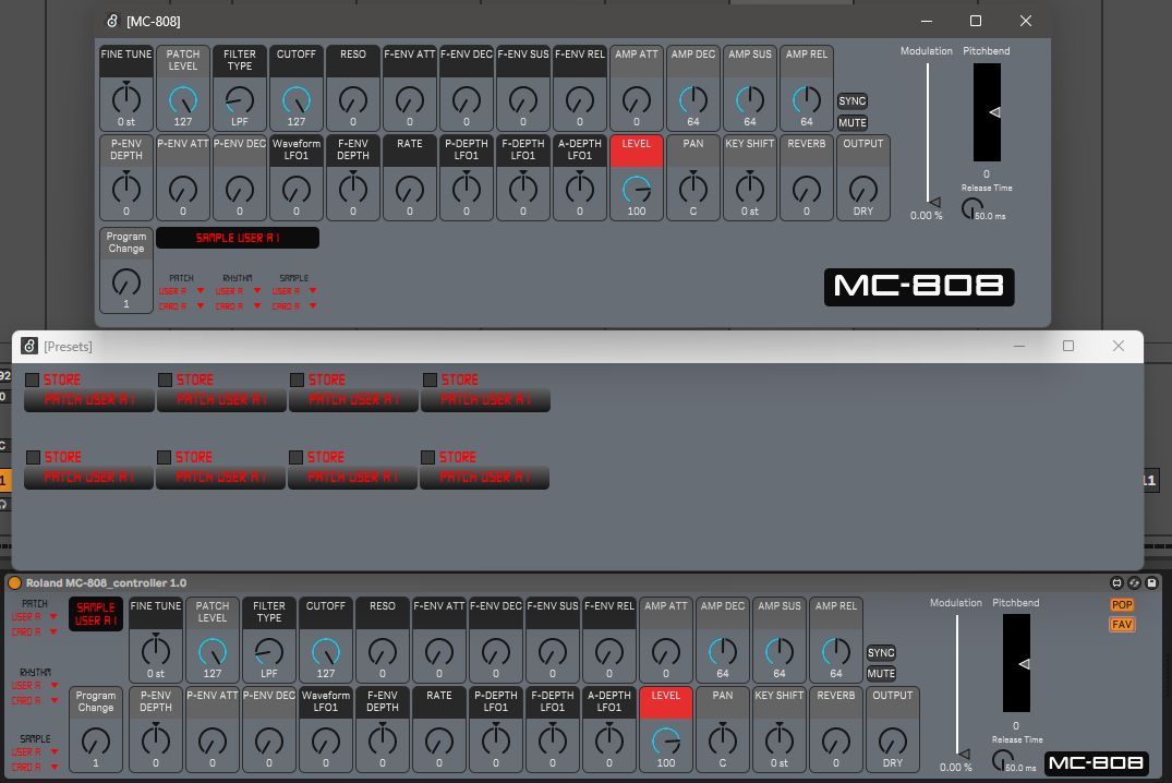 | Description: | A very simple MIDI CC controller for the Roland MC-808 Groovebox. Bank, Sub-bank & Program Change Mod Wheel for Matrix Control Pitchbend that returns to zero like a pitch wheel when mouse up, with "configurable" timing release Pop-out window |