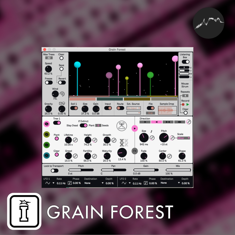 | Description: | GRANULAR SYNTH AND EFFECT DRIVEN BY AN EVOLVING FOREST SIMULATION Grain Forest is a maxforlive granular synth and effect. The granular playback and FX are driven by a simulation of a forest that evolves through DNA mixing and mutations over generations. Each tree in the forest is an independent grain or voice that has its own DNA which modulates the grain’s playback and FX parameters depending on how you set up that tree species (up to 4 species). Pollen from trees can mix DNA with another tree and create a new seed, optionally with mutations. The trees sample audio and grow from the “soil” beneath them, each soil type can have its own unique audio mix coming from various audio sources. This all adds up to a literally evolving soundscape sampled from multiple audio sources! Grain Forest can be a granular delay, a texture, a glitchy/chaotic effect, a dynamic sampler, or whatever way you figure out how to use it. |