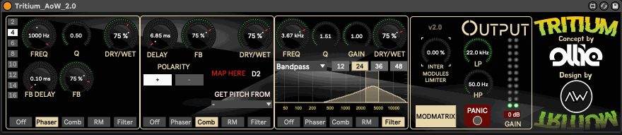 | Description: | Tritium is a psychedelic audio destructor M4L co-designed with Ollie and developed by your faithfully. From subtle effects to complete destruction and anything in between, Tritium is meant to breathe psychedelic life into any signal you feed in it. It consists of four modules (three being active at the same time), based on Ollie’s sound design philosophy: A lush, very versatile phaser/delay to color the sound slightly or more heavily depending on how hard you push it A ring modulator to really propulse the sound into the psychedelic realmc, adding subtle bell-like tones to more extreme metallic or robotic sounds A carefully crafted comb filter, adding that sense of depth and dimension in the sound, almost like you're hearing it in a large, reflective space like a hall or a canyon. A fully configurable filter to shape your sound All modules can be placed at any given position of the three units using a simple selector. Plus, Tritium comes with a full modulation matrix of three audio rate LFOs, allowing you to modulate ANY of the parameters from 0.01 Hz up to 22kHz to go from ultra subtle evolution to totally mangled sound. Finally, Tritium comes with a set of presets popped out of Ollie's genius mind to get you going with your psychedelic sound experience ! Video walkthrough here: https://youtu.be/wH7meSkYflY Video walkthrough of v2.0 update: https://youtu.be/TtAJNxe_HJU In more detailed, here's what you get: a fully parametric phaser: from 2 to 16 stages, with configurable delay, Q factor and feedback a ring modulator that will combine the sound with a configurable sine wave signal. Plus you get 3 different distorsions out of the module: saturation (Korg LP35 style, an exclusivity of my devices), overdrive and bitcrush A comb filter, with configurable polarity, delay and feedback A filter, with 9 different shapes and 4 different slopes. both the RM and the Comb can be set to follow midi information to set their frequency to midi notes. For that you'll use the midi send device, placed on any midi track, and activate one of the eight available bus. On Tritium side simply set the ring modulator or comb filter to "listen" to the same channel. It will automatically follow these notes... the mod matrix provides, in a floating window, 3 LFOs with 8 different shapes, that can be configured in ms/time division/hertz or pitch, each one having up to 8 targets, both unipolar or bipolar. Plus, each output of the LFO can be quantized to any given number of values to achieve stepped effects A compressor/limiter has been put between each stage of the module, to tame potential gain boosts added by them. Each module will glow red if it's too hot so you visually can check instantly if and how much you need to engage the compressor |