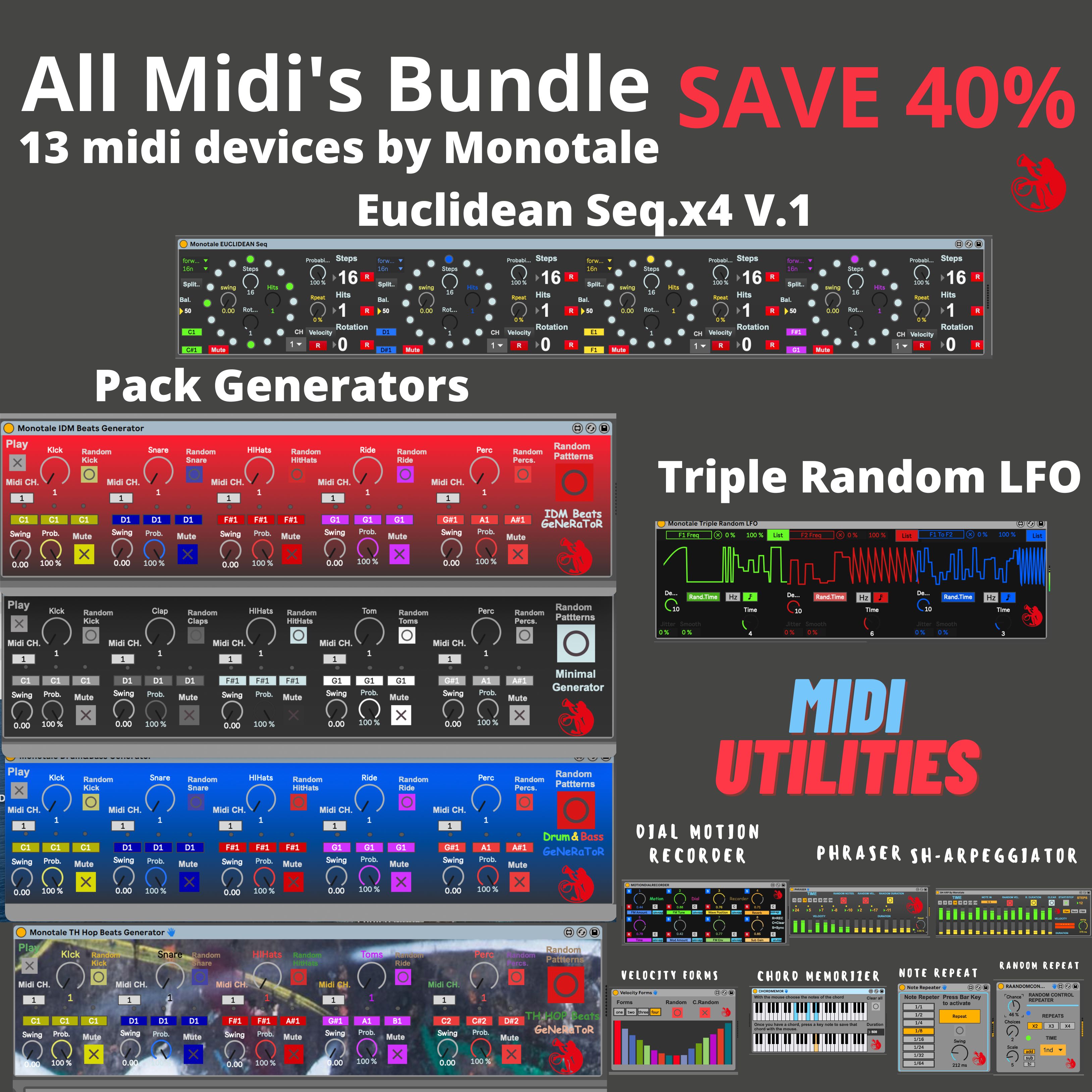 | Description: | All Midi Bundle By Monotale, Save 40% off. 13 midi devices at a super offer!!! See: MIdi Utilities : https://youtu.be/4h21wSjOirk Pattern Generators : https://youtu.be/UaRjK16Ef7k Euclidean Seq.: https://youtu.be/bha5Jpe4gyI Dial Motion Recorder: https://youtu.be/4h21wSjOirk Triple Random LFO: https://youtu.be/4n3NRPOeMUs Enjoy! |