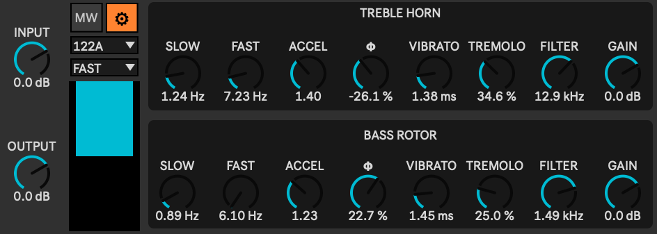 | Description: | Rotary Speaker (Leslie) effect. One of my first M4L devices was also called Rotary, now renamed "Rotary (Legacy)". There were a number of improvements I'd made to the original model, including more cabinet types, a brake (stop) mode, and the bass rotor is now stereo rather than mono. The phase parameter lets you set the stereo width "mic placement, by determining which channel you will hear first. It can also be used to create a counter-rotating effect between the bass rotor and treble horn. The "cog" will toggle the advance parameter panel so that the effect can be tweaked. The device will fold back down to a compact size when this is toggled off. The MW toggle enables modwheel control over the speed. For this to work, you need to first route midi to the device. The IR's should be saved in the .amxd file, however, I also included an achieve that contains all of the IRs for the organ effects incase you need it / want it. The would just need to be unzipped to the same location as your effect (with the files in the same folder, not in a subfolder). |