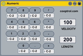 Description: This is a very simple device designed to use a numeric keypad as a note generator. You must map the keypad keys to the buttons on the device. You can assign a different note to each key and a global velocity and duration.
