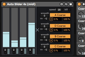 | Description: | FOR LIVE 12 USERS: finleguin's highly useful 'remote2mod' device works great with autosliders (until i can make a live 12 modulation' version): https://maxforlive.com/library/device/10291/remote2mod INSTRUCTIONS: just drag a slider and this automatically records your movements for that slider. map to whatever params within your project. includes a play/pause per slider, reset phase, playback direction, global speed, and smoother option. the midi devices have optional midi cc out. saves the automations with your project. great for experimental and generative music since the automations you record run out of sync from each other. i believe you can record up to about 69** hour's worth of automation for each slider ;] tip1: you can use the shift key for incremental slider movements. press the ctrl key to allow recording to still go on even while you let off the mouse (to create jumps in the sliders). v1.1 - added keyboard modifier "control" (osx=command) record-on function. so while the ctrl/cmd is pressed, you can then unclick your mouse and move the cursor to other areas on the same slider(or even a different slider!) and continue click-dragging for jumps in your automations. interestingly, you can also start recording the movements of multiple sliders at once a long as ctrl/cmd key is continuously held. v1.2 - added midi cc out option in the midi devices. fixed a weird little initialization bug. fixed midi out not working. v1.3 - added play/pause feature per slider. added reset phase button (can be automated to sync the sliders to the grid). added play direction (0=forward, 1 backward, 2 pingpoing). added global speed control(in ms. 1 = faaast, 100 = slooow. 25 is the sweet spot). added a global kill loop/init button. gussied up the gui a bit. added an instructional legend .jpg into the .zip. fixed a couple small weird bugs. future updates may include: add a built in user presets option that allows you to save/recall(via automation) multiple slider recordings per device. note: you can just overwrite the old v1.2(and below) .amxd files with these new ones without losing any slider automation data in your preexisting projects. in fact, you can even go from 1.3 backwards if need be and the slider recordings/mappings shouldn't get lost. the .zip includes 4 devices: Auto Slider 1x (audio).amxd - 1 slider, 8 mappers Auto Slider 1x (midi).amxd - midi variant of the above Auto Slider 4x (audio).amxd - 4 sliders, 1 mapper per Auto Slider 4x (midi).amxd - midi variant video demo live sketch showing off, in part, the auto slider devices: https://www.youtube.com/watch?v=_B8FaAgEvBc similar free devices worth checking out: https://maxforlive.com/library/device/2316/autodial - can be tempo sync'd and lets you draw the recorded knob movements, but can't record very long automation loops. https://maxforlive.com/library/device/2317/autodial-xy https://maxforlive.com/library/device/2405/gratis-hits-bundle - namely the xy gesture, from which i borrowed a bit. **the counter is set to 9999999 and the dict gets a new line every 25ms. hence the 69, and change, hours |