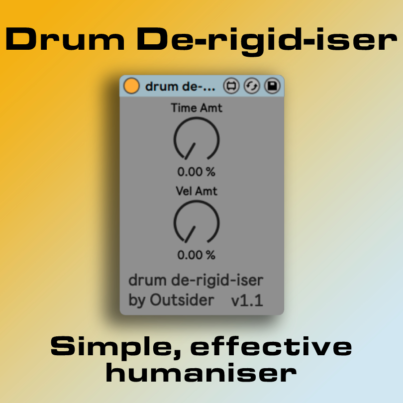 | Description: | Updated to v1.1! Redesigned timing and velocity processing, now works with Toontrack Superior Drummer as intended. Not just for drums! Simple and effective MIDI "humaniser". Drum De-rigid-iser is a Max for Live MIDI effect that's designed to liven up stiff-sounding drum patterns and melodies. It delays MIDI notes by a random amount within a range you set (up to one beat/quarter note, synchronised with your project tempo), letting you go from subtle looseness all the way to "oh dear god the drummer has fallen down the stairs and somehow taken their whole kit with them". Other humanise functions often make notes either early or late, but this can sound sloppy (in a bad way) and unnatural, so Drum De-rigid-iser only makes them late instead. Drum De-rigid-iser also features a MIDI velocity randomiser so that you can broaden the dynamic range of your MIDI clips with a single control. Also, this device pairs really well with Ableton's "Grooves" function! Give your track some shuffle and swing with a Groove to change up your rhythmic feel, then use Drum De-rigid-iser to nudge everything off that grid and liven things up even more! A straightforward tool to energise and loosen up robotic-sounding MIDI tracks! |