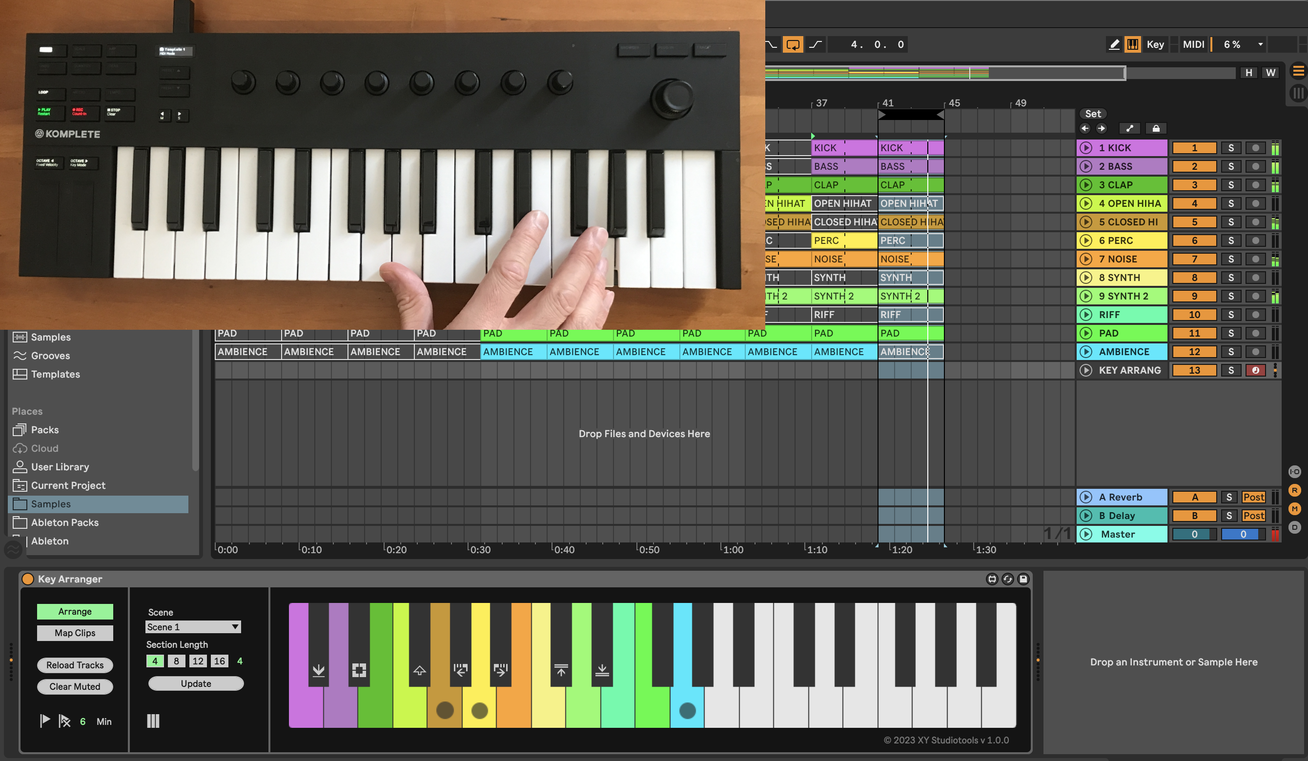 | Description: | Key Arranger is a Max for Live device for arranging songs in Live’s Arrangement View just by pressing keys on a Midi Keyboard. The Key Arranger workflow makes it easy to try out different combinations of sounds and fluently create sections at your own pace. With Key Arranger, you can mute and unmute clips by pressing keys on your keyboard and thereby try out and listen to different combinations of sounds. You can work on a section as long as you like, then save and move on to work with the next section. In that way, the tool combines the intuitive qualities that you normally only get in the Session View with the linear workflow of the Arrangement View. Demo: https://youtu.be/p3Vr3fsqjtM Tutorial: https://youtu.be/PKwfj915cv0 To start, set a section length of your choice by adjusting the loop in Live's Arrangement View and enable your clips for arrangement. Then, by pressing keys on your keyboard your clips will unmute or mute. This makes it possible to quickly hear how different parts sound together, and what it sounds like if you add or remove parts to what is currently playing. When you have a combination that you want to keep, use a dedicated key on the keyboard to keep the section and get a duplicate to work with next. With Key arranger you can sketch out a full arrangement just by using your keyboard and one function key. There are also additional features such as: - switch scenes - adapt section lengths - capture more detailed arrangements within your current section length - map a group of tracks to one key, and map individual sounds from a drum rack to separate keys System Requirements: Mac OS (Sierra or later), or Windows 10/11 Ableton Live 11 RAM: minimum 8GB, recommended 8GB+ Midi Keyboard |