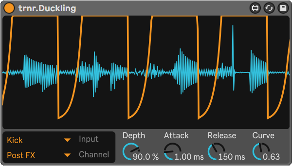 A free simple ducker device that can be triggered via MIDI. Just drop it on a track that should be ducked, select a MIDI track to trigger it and adjust the envelope to taste. |
