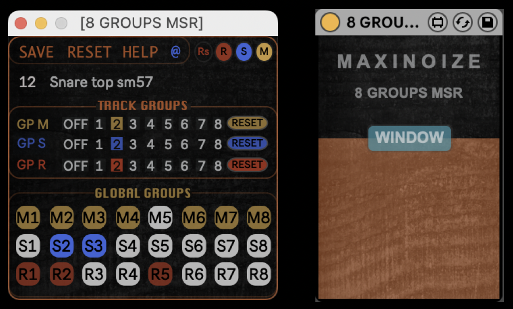 | Description: | ---What is 8 GROUPS MSR ? "8 GROUPS MSR" is an M4L plugin for Mac OS and Windows that allows you to create 8 groups of mute, solo, and record with a maximum of 64 audio/MIDI tracks. Démo vidéo here : https://www.youtube.com/watch?v=Ax2tRawiU9U&t=9s ---USAGE Place a single instance of this device on the master track. Press "Window" to display the floating window. The interface has been designed to fit in the "comment, info" window without obstructing the view of different plugins. ________________ Version History: 1.0.0: Initial release 1.0.3: Added new features and improvements 1.0.6: Fixed various bugs and optimized performance 1.1.2: Introduced compatibility with Live 11 1.2.4: Enhanced user interface and added additional functionality 1.4.5: Improved stability and resolved known issues 1.6.6: Added support for Native Apple M1 and M2 processors 1.6.8: Fixes a bug at the window startup on screens larger than 24 inches. The window's position is now saved in your session when you save the device. |