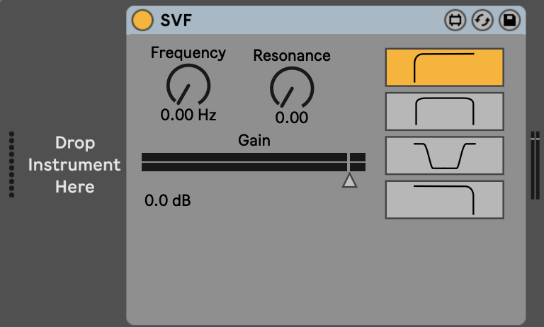 | Description: | This SVF audio device is a State-variable filter with simultaneous outputs used for audio filtering and additional resonance feature. |