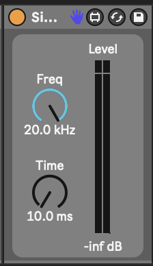 | Description: | A simple device to generate a sine wave at a certain frequency (10Hz-20kHz), lasting from 1-3000ms. Triggered by "Note On" MIDI input. |